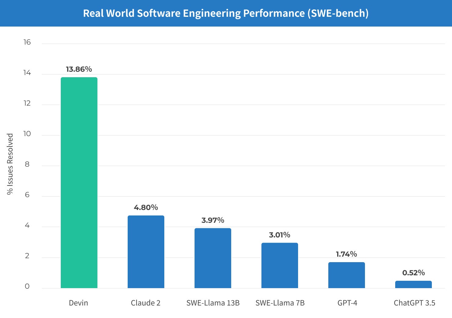 また、実際の開発プロセスで発生した課題を解決する能力を測るベンチマーク「SWE-bench」において、Devinの自律的な問題解決率は13.86%という数値を示しています。